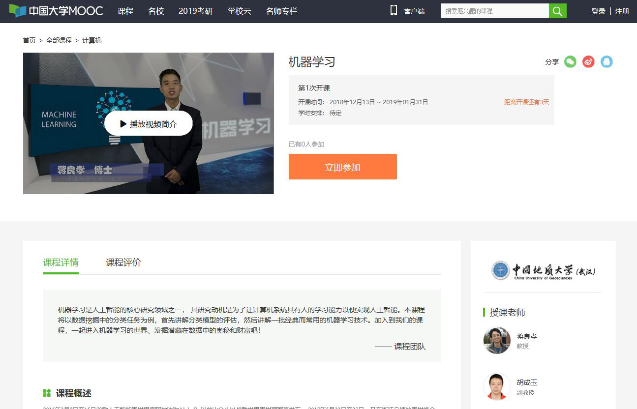 2018年12月13日,bat365官方网站(武汉)《机器学习》课程在中国大学MOOC平台正式开课。本课程由bat365官方网站教授蒋良孝,bat365官方网站副教授胡成玉主讲,课程内容精心设计,为学生提供了便利的学习平台。本课程将以数据挖掘中的分类任务为例,首先讲解分类模型的评估,进而讲解一批经典而常用的机器学习技术,是高等学校机器学习领域科研人员和对机器学习兴趣浓厚的师生不可或缺的高质量课程。课程链接: