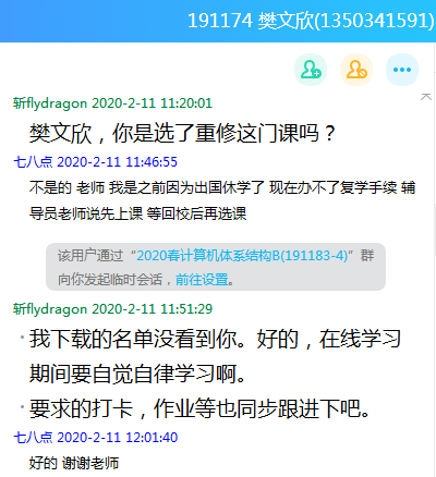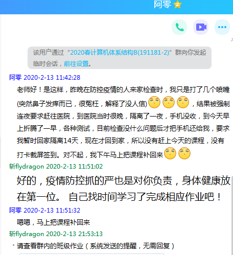 在课后,刘超老师牺牲自己休息的时间,在线帮助同学们实时解答学习过程中遇到的问题,并时刻关注未能按时上课和提交作业的同学,兼具教学要求和人文关怀,让学生在抗击疫情的特殊时期,感受到温暖和关爱;