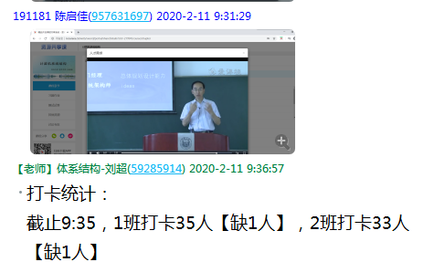 实时关注学生上课状态,利用QQ群进行视频截图打卡签到,严肃在线教学的课程纪律,帮助学生养成良好的学习习惯,促进在线教学的严格管理;
