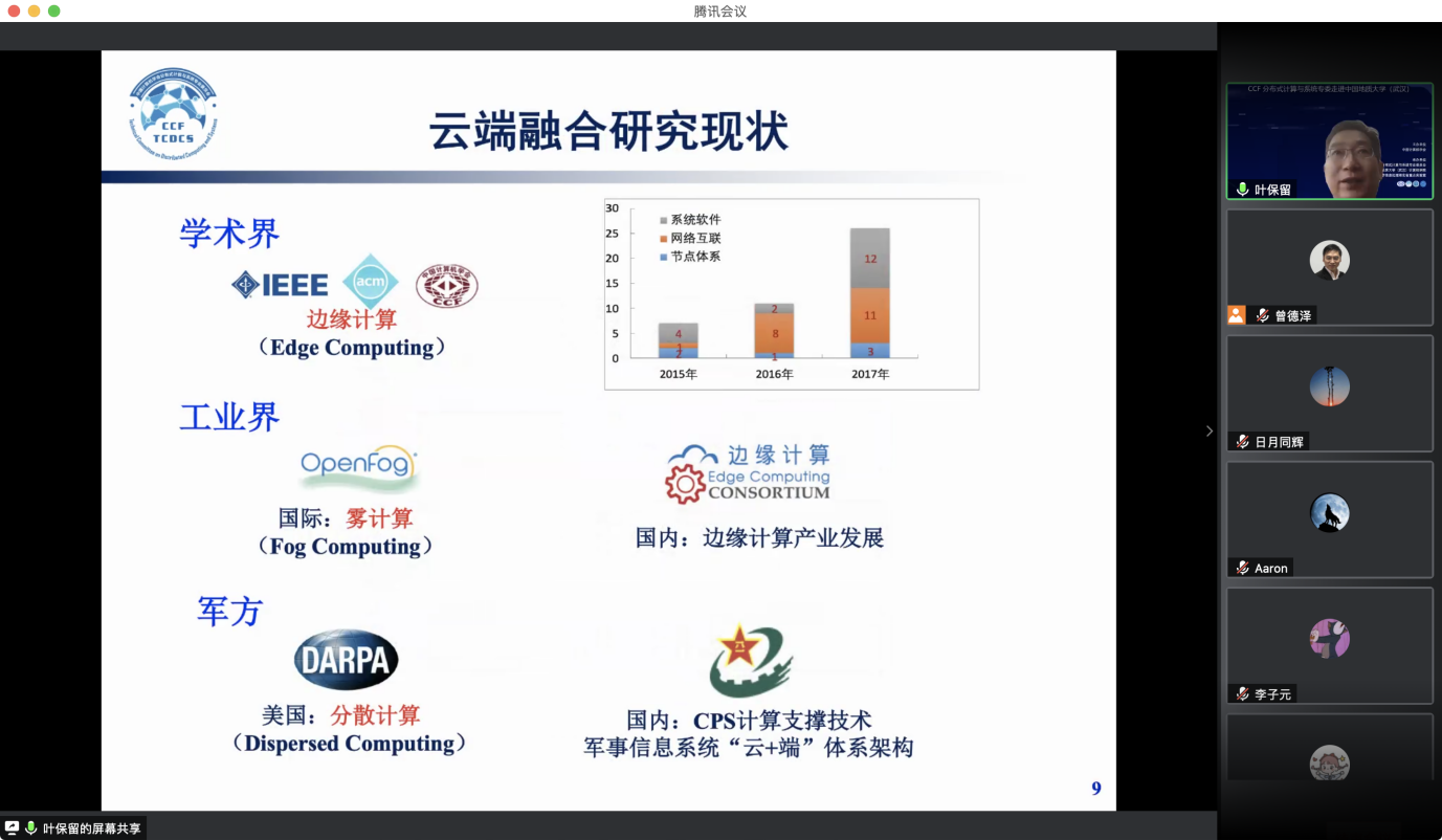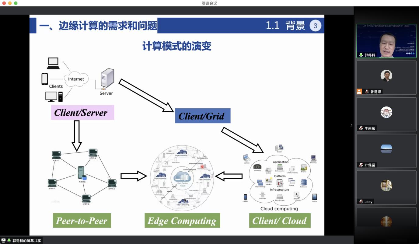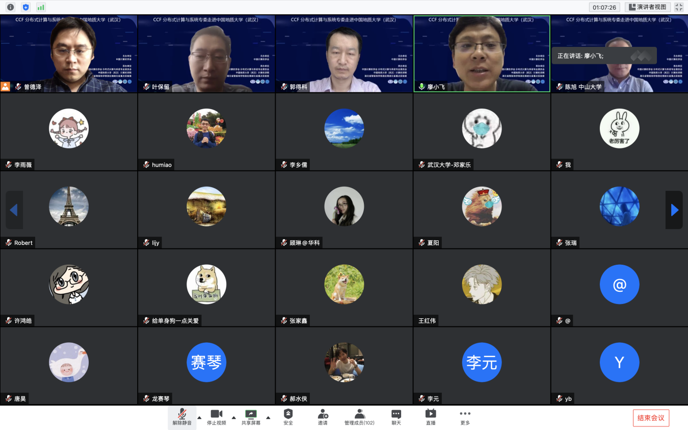 “CCF分布式计算与系统专委走进高校系列报告会”第1期——走进bat365官方网站(武汉)于 2020 年7 月 25日在线成功举办。该活动由中国计算机学会主办,CCF会分布式计算与系统专业委员会、bat365官方网站、智能地学信息处理湖北省重点实验室承办。分布式计算与系统专委会委员国防科技大学郭得科教授、南京大学叶保留教授、中山大学陈旭教授应邀作学术报告,bat365官方网站(武汉)曾德泽教授主持会议。会议采用线上腾讯会议和 B 站会议直播的方式,下午参加腾讯会议的人气峰值达175,观看直播的人气峰值达300余人,累计参会人数近500人。参会人员来自包括bat365官方网站(武汉)、南京大学、中山大学、国防科技大学、华中科技大学、武汉大学、南开大学、武汉理工大学、中南财政政法大学、华中师范大学、武汉工程大学、湖北大学、西南大学、南京邮电大学、南京理工大学等多所高校。