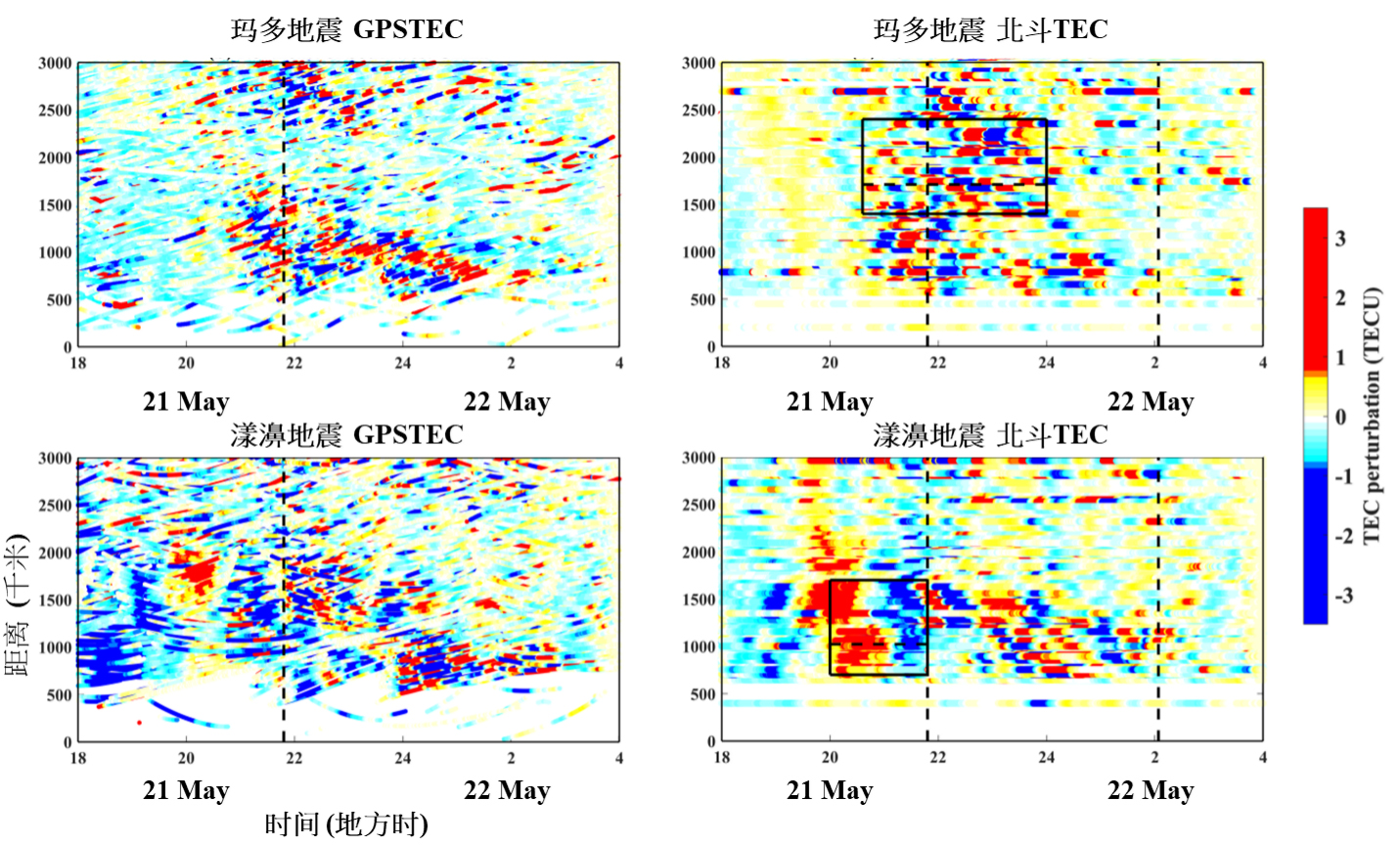 北斗同步卫星TEC能观测到传统GPSTEC观测时, 无法察觉的信号(黑框表示的位置)