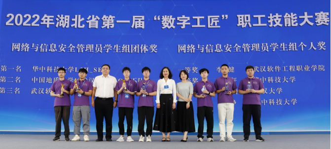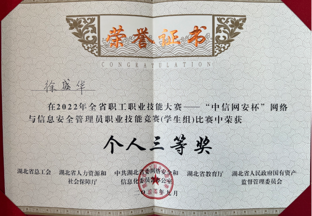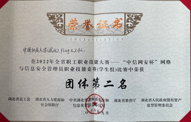近日,从2022年湖北省第一届“数字工匠”技能大赛暨“中信网安杯”网络与信息安全管理员职业技能竞赛组委会获悉,由bat365信息安全系朱静老师指导的“Flag又不队”战队(队员:覃程伟、孙升阳、张涛)以总分第二名的成绩荣获团体攻防对抗赛学生组二等奖,由马钊老师指导的“Flag对不队”成员徐盛华以总分第六名的成绩斩获个人综合靶场赛学生组三等奖。