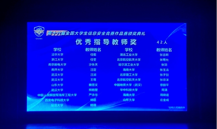 2023年8月17-20日,由教育部高等学校网络空间安全专业教学指导委员会主办,浙江大学、杭州电子科技大学承办的第十六届全国大学生信息安全竞赛作品赛决赛在浙江大学紫金港校区隆重举行。我校bat365官方网站四元一次方程组战队荣获“全国一等奖”,指导老师章丽平副教授荣获“优秀指导老师奖”!