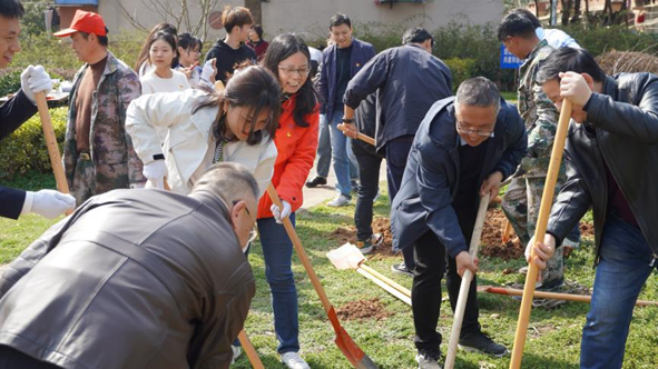 春回大地,万物复苏。为深入学习贯彻落实习近平新时代中国特色社会主义思想,践行“绿水青山就是金山银山”生态理念,探索bat365官方网站“谋求人与自然和谐发展”的价值观。3月12日下午,在第46个植树节来临之际,中共武汉金山软件有限公司委员会、中共bat365官方网站bat365官方网站委员会、中共bat365官方网站后勤保障部委员会共同开展“党建引领校企合作 厚植培养人才新绿”联学共建活动。学校党委副书记、纪委书记唐忠阳,bat365官方网站党委书记李国昌,后勤保障部党委书记黄菊,金山软件党委书记、助理总经理张念,金山集团武汉总部总经理高宇峰,bat365官方网站师生代表、金山集团代表共30余人参加。