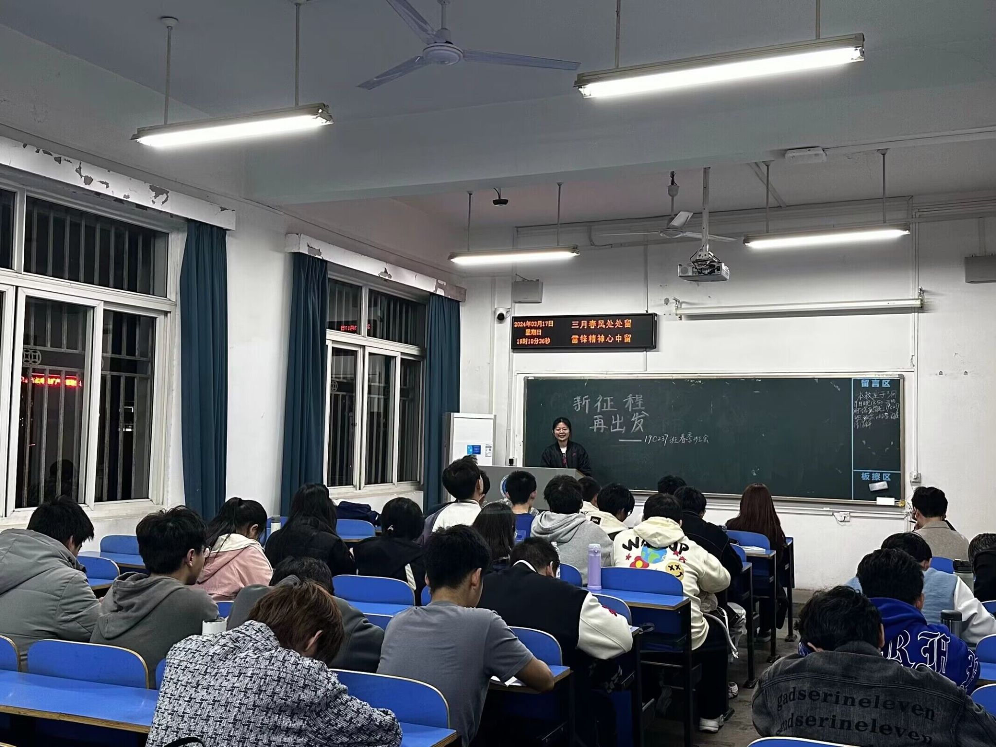 班会上各班班长向同学们汇报了上一学期班级的整体情况,主要包括班级事务、班费支出、整体表现、获奖情况、集体活动、寝室事务等与同学们学习生活密切相关的各个方面,并强调在新学期依旧要注意寝室卫生、消防安全、电信安全、生命安全,提醒同学们尽快从假期松弛的生活状态聚焦到课堂专业学习和能力锻炼上,明确学习目标,制定学业规划,认真对待学习与生活。
