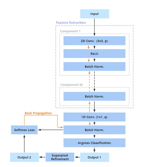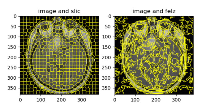 五、改进Slic-FCN无监督分割模型,实现训练即预测,无需图像标注的自分类模型。对比slic和felz这两个传统的基于聚类的算法在脑部MRI图像上的表现,我们选择用felz算法替代slic算法做预分类,使用FCN对Felz分割的细粒度预分类结果进行迭代处理,逐步对小区块进行合并,最后得到符合预期的语义分割结果。