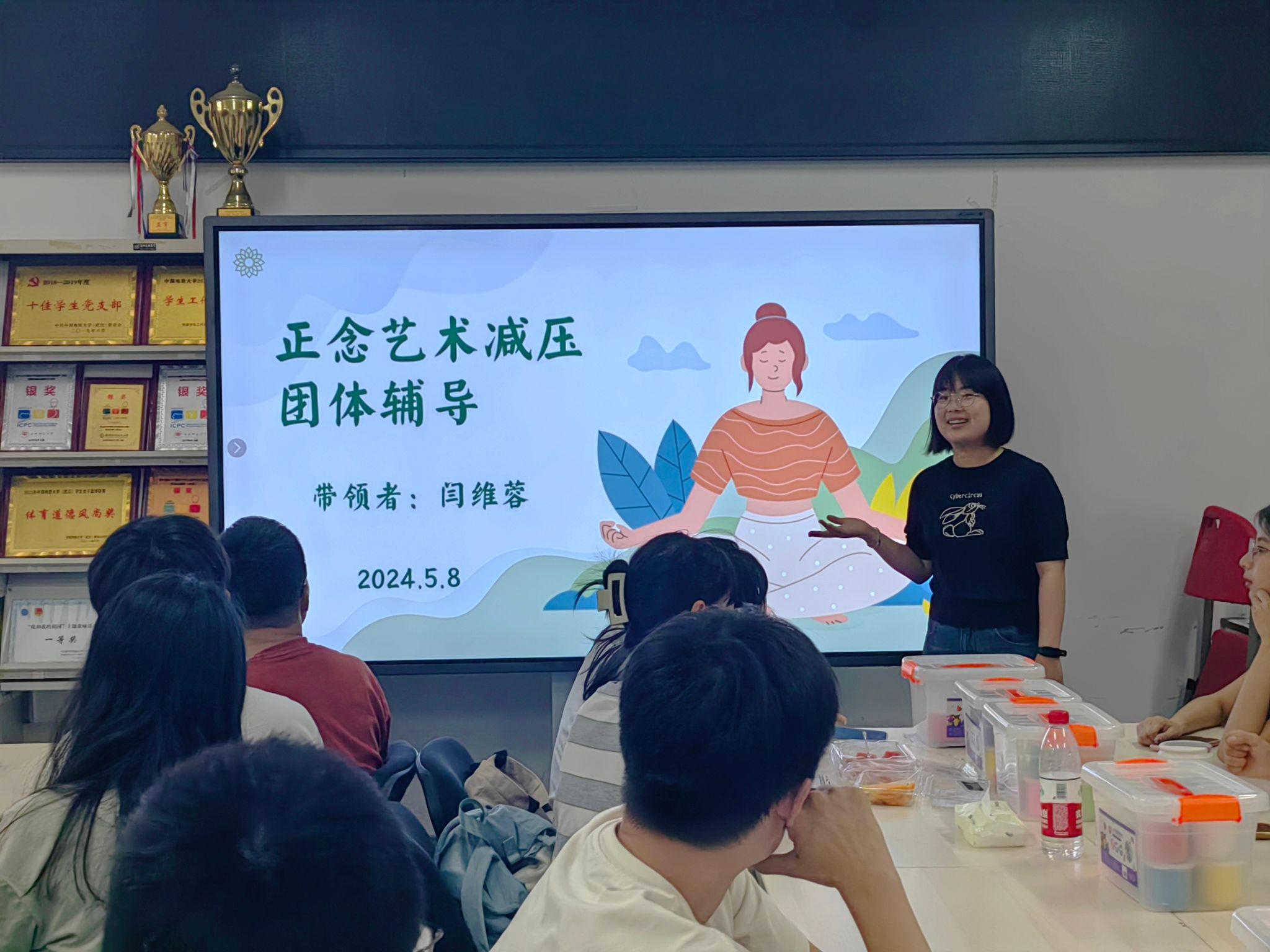在5·25全国大学生心理健康日来临之际,为丰富学院心理健康教育活动,引导学生关注和呵护自身的身心健康,缓解工作学习带来的压力和紧张焦虑情绪,5月8日晚上,由bat365官方网站E心为你二级心理辅导站举办的5·25心理健康月系列活动之正念艺术减压团体辅导在bat365官方网站大楼101举行。学院党委副书记林小艳和20余名师生参与本次活动,活动由学院心理健康辅导员闫维蓉带领。
