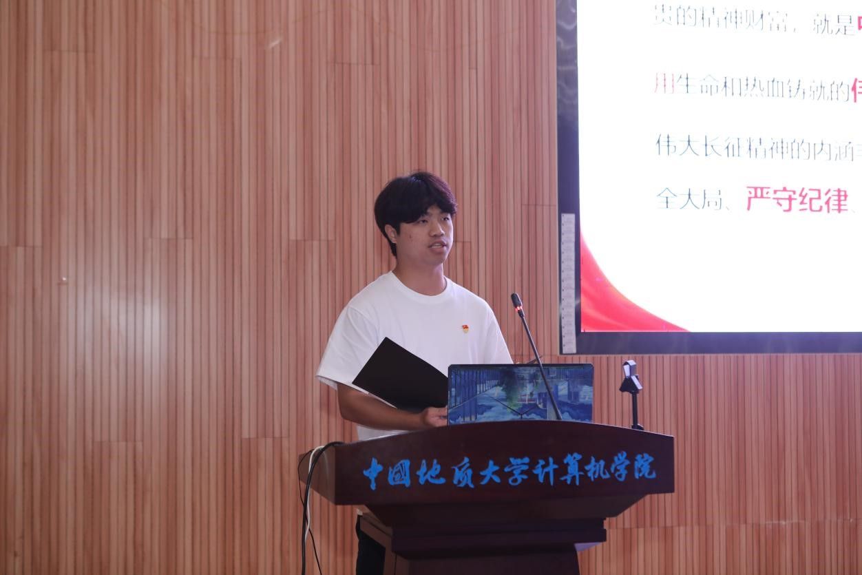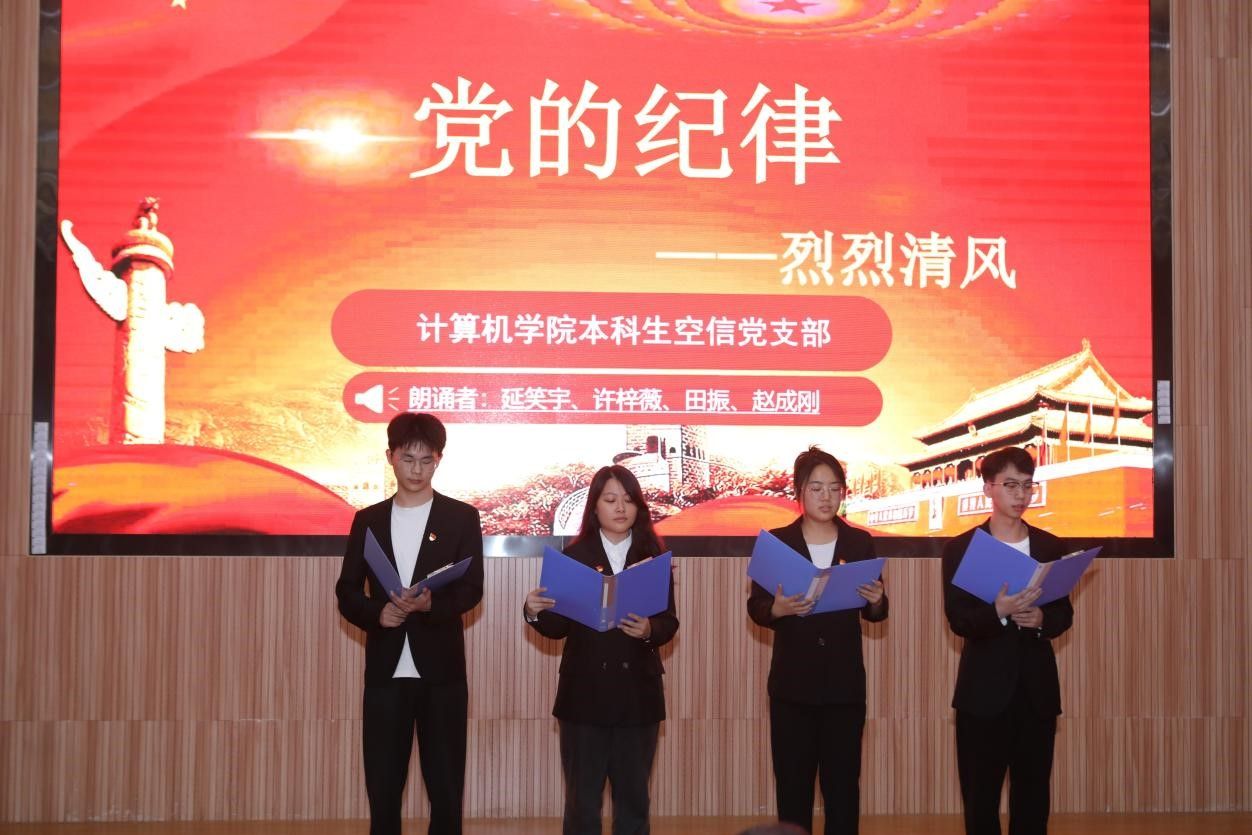 活动在雄壮的国歌声中拉开帷幕。学生党支部书记率先登场。电子信息第三党支部朱国强以刘邓大军的严明军纪为例,强调了纪律在军队建设中的重要作用。本科生信安党支部郭鹏顺则从新民主主义革命时期的党纪建设出发,强调了坚守初心、严明纪律的意义。本科生空信党支部延笑宇等多名成员以“党的纪律:烈烈清风”为题的诗歌朗诵,声情并茂地展现出对党廉政建设的歌颂。本科生计科第一党支部王诗敏则以延安廉政的故事为蓝本,深入剖析了党在推动廉政反腐方面的必要性和坚定决心。电子信息第二党支部潘灿通过讲述郭明义的故事,展现了廉洁奉公、无私奉献的崇高精神。电子信息第一党支部胡长浩深刻阐述了铁纪在长征这一伟大的历史事件中的关键作用。在bat365官方网站空间信息工程党支部与经济管理学院生态文明研究生样板党支部成员的精心编排下,以一场独具特色的话剧将现场气氛推向了高潮,生动诠释了“亲民爱民、艰苦奋斗、科学求实、迎难而上、无私奉献”的“焦裕禄精神”。