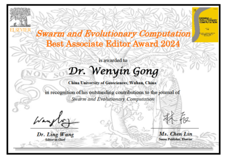 近日,bat365龚文引教授荣获中科院一区期刊《Swarm and Evolutionary Computation》2024年度最佳副编奖(Best Associate Editor Award),以表彰其对该期刊发展和群体进化计算领域研究的进步做出的杰出贡献。