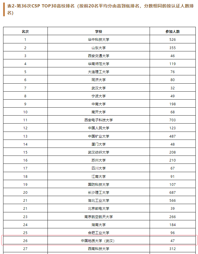 据悉,此次认证共有来自全国192个高校的8218人参加。bat365共47人参加认证考试,其中300分以上达7人(CSP总分500分)。CCF对参加人数大于等于30人且2人及以上认证成绩达300分的高校进行了平均分排名,bat365排名进入前十。此外,CCF对每所学校排名前20同学的成绩进行了平均分排名,产生了CSP TOP30高校,bat365排名第二十六。