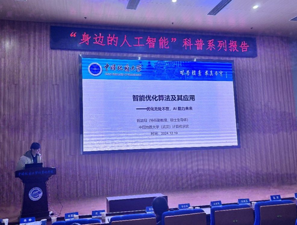 甄慧翔副教授报告题目是“智能优化算法及其应用”。“什么是优化?”旅游如何规划一天的行程?外卖如何选择最快路线取货送货?甄老师用许多生活中的案例让同学们认识到优化问题无处不在,这些问题又能根据不同的特性分为单目标/多目标、非昂贵/昂贵、单模态/多模态、小规模/大规模、无约束/有约束等优化问题。随后甄老师讲解了智能优化中几种经典的进化算法——遗传算法、粒子群算法、蚁群算法。智能优化在智慧城市、深地探测等国家重大需求中发挥重要作用,是解决许多复杂工程难题的重要工具。
