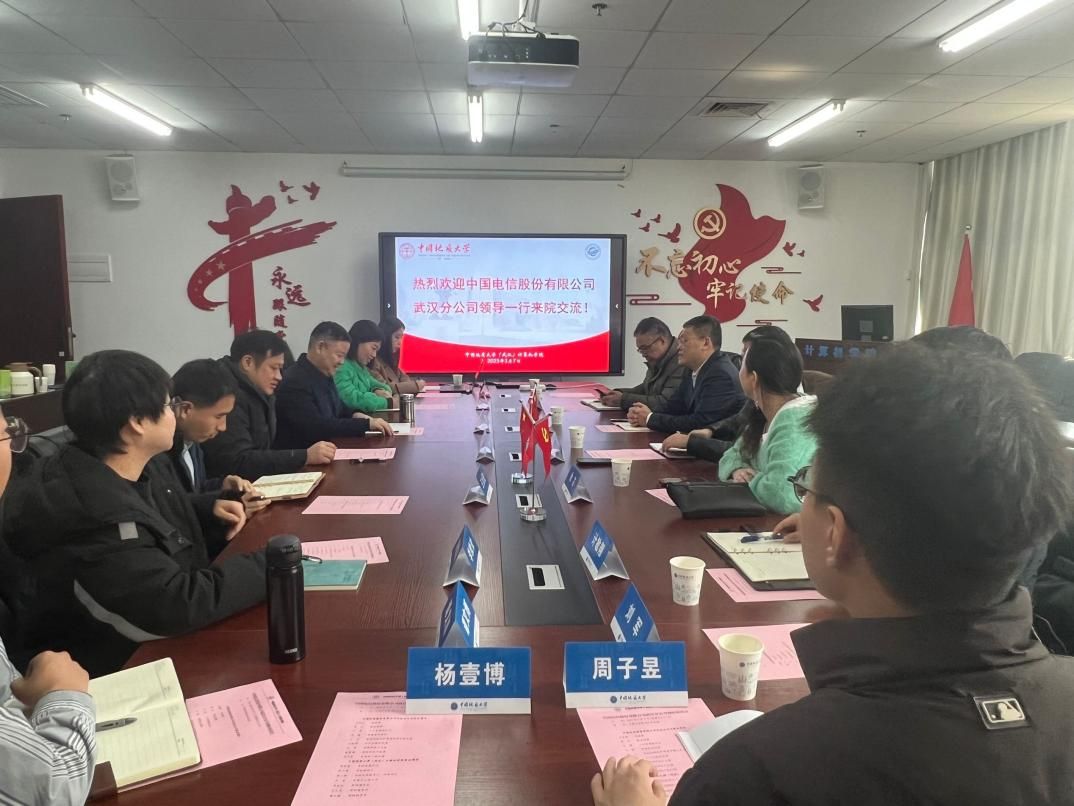 3月7日上午,中国电信股份有限公司武汉分公司来院调研座谈。双方在学院309会议室就校企合作、学生实习、就业等方面进行了深入交流。中国电信武汉分公司总经理代宏斌、副总经理覃兵、人力资源部主任石涛、校园部总经理吴峰等领导,bat365官方网站党委书记李国昌、副院长陈云亮、党委副书记林小艳等学院领导及辅导员代表参加会议。李国昌主持会议。