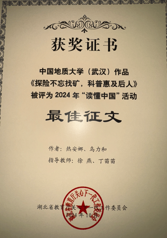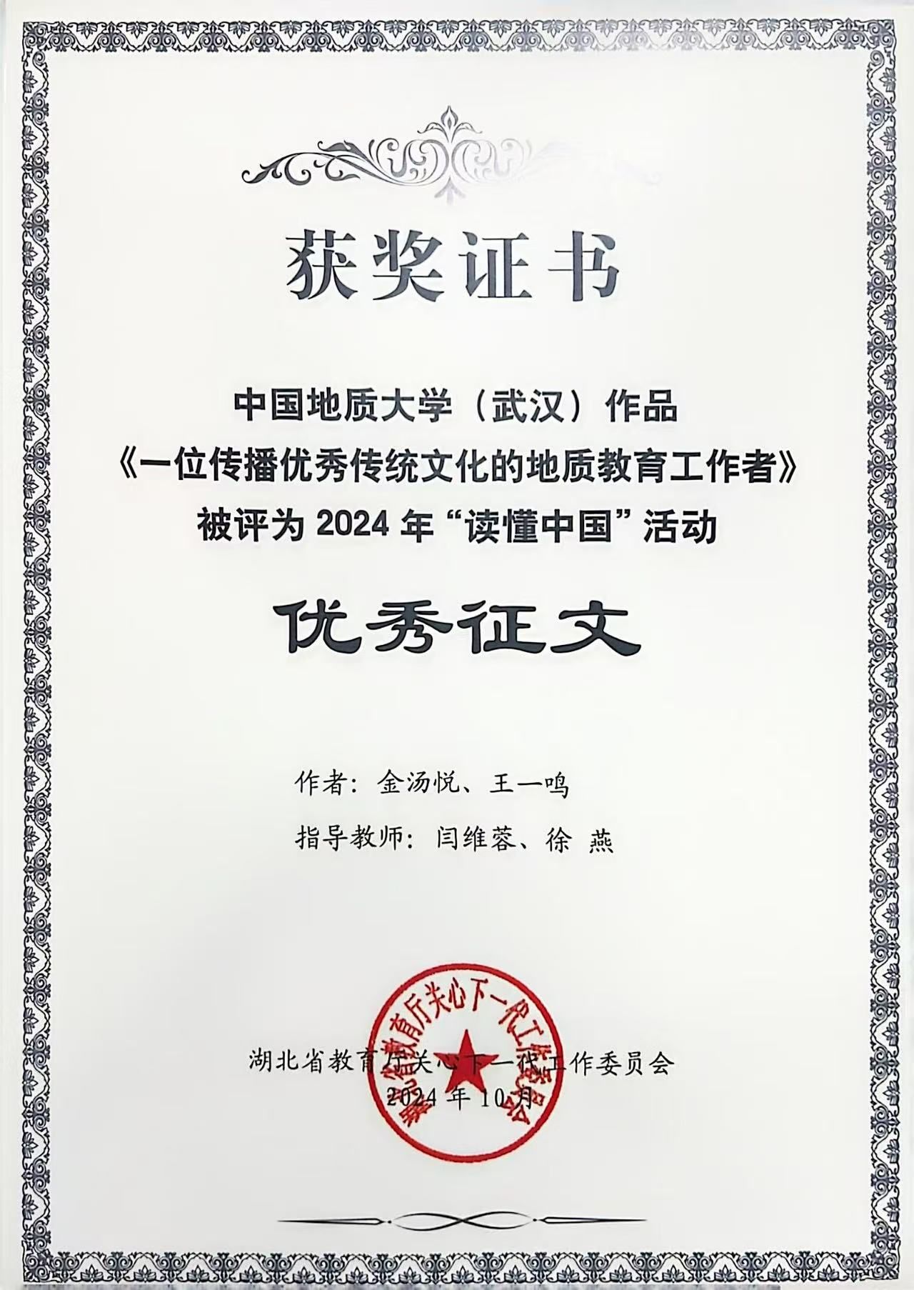 在征文赛道,由bat365热安娜、乌力和同学参与撰写的《探险不忘找矿,科普惠及后人》,以深邃的视角记述了费宣校友这位脚下是山河湖海、心中有星辰和梦想的地质人,获评湖北省2024年“读懂中国”活动最佳征文。由bat365闫维蓉、图书档案与文博部徐燕老师指导,金汤悦、王一鸣同学撰写的《一位传播优秀传统文化的地质教育工作者》以细腻的笔触勾勒出曾佐勋教授40余年教书育人、传播中华传统文化的动人故事,获评湖北省2024年“读懂中国”活动优秀征文。
