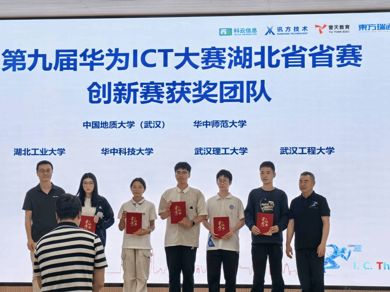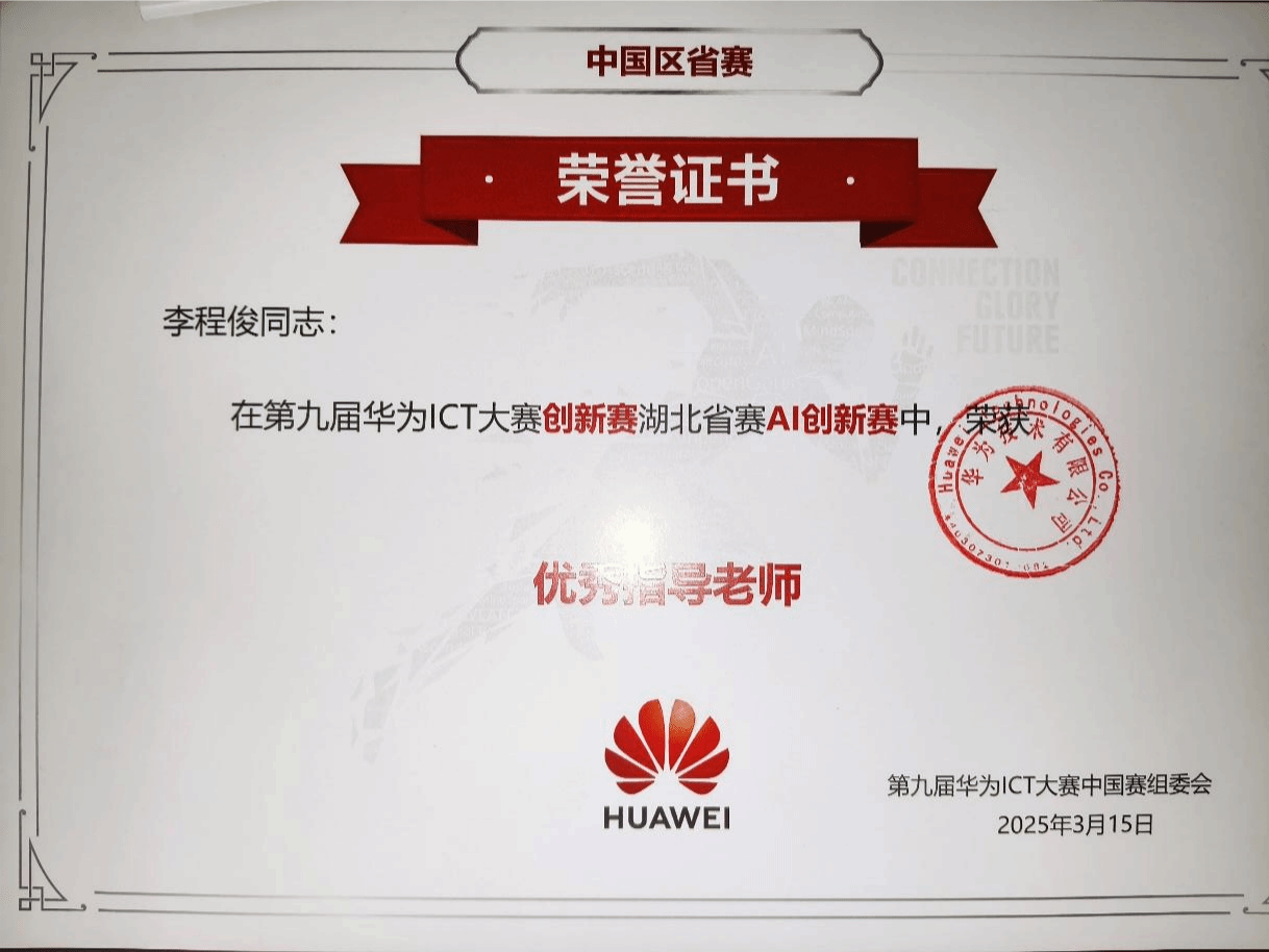4月28日,第九届华为ICT大赛湖北省赛颁奖典礼在湖北科技职业学院关山校区隆重举行。bat365大数据系李程俊老师在“第九届华为ICT大赛创新赛湖北省赛AI创新赛”中获优秀指导老师,学校为“第九届华为ICT大赛创新赛湖北省赛获奖团队”。