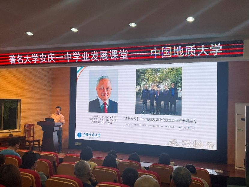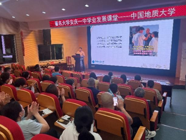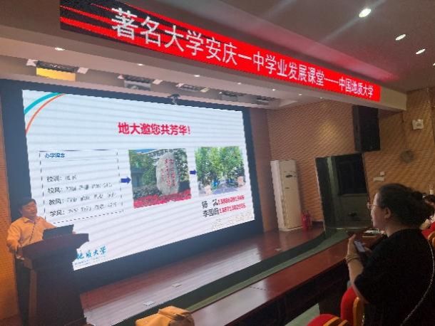 ,安庆一中行政楼阶梯教室李国昌书记进行了“邀您与孩子绘就民族复兴伟业新画卷”的主题宣讲他分别从“安徽人与地大人”、“奋进中的地大武汉”、“在皖计划录取及学生发展”、“报考建议”等多个角度全面介绍了地大概况以及家长关注的报考问题详细报告了近五年安庆一中生源的发展及就业情况,其中2020级的三位同学均获得了保送资格,分别保送至本校、首都师范大学和复旦大学。