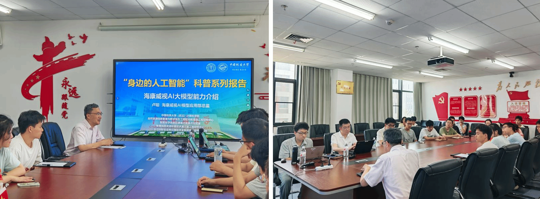 在互动交流环节,现场师生围绕大模型技术难点、行业应用拓展积极提问,卢聪总监结合海康实际案例,对模型训练效率提升、跨场景适配挑战等问题答疑解惑。海康威视湖北分公司的刘洪杰经理、丁瀚翔经理也参与了互动交流讲解。