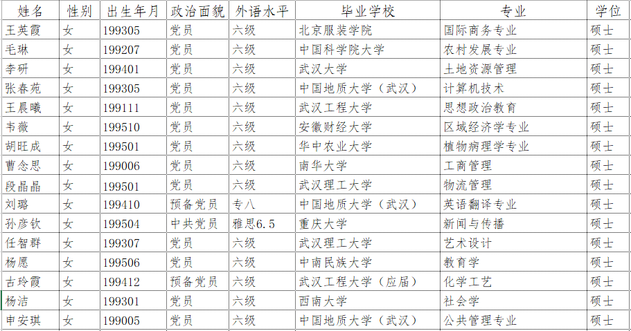 bat365官方网站面向社会公开招聘工作人员已完成对报名人员资格审查,根据优先聘用条件(党员或预备党员+CET6或雅思6.5以上或专业4级以上+硕士)确定参加笔试人员名单如下(排名不分先后):