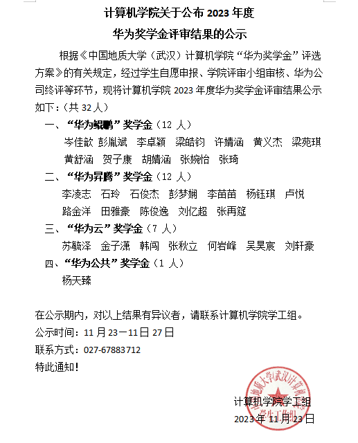 bat365官方网站关于公布2023年度华为奖学金评审结果的公示