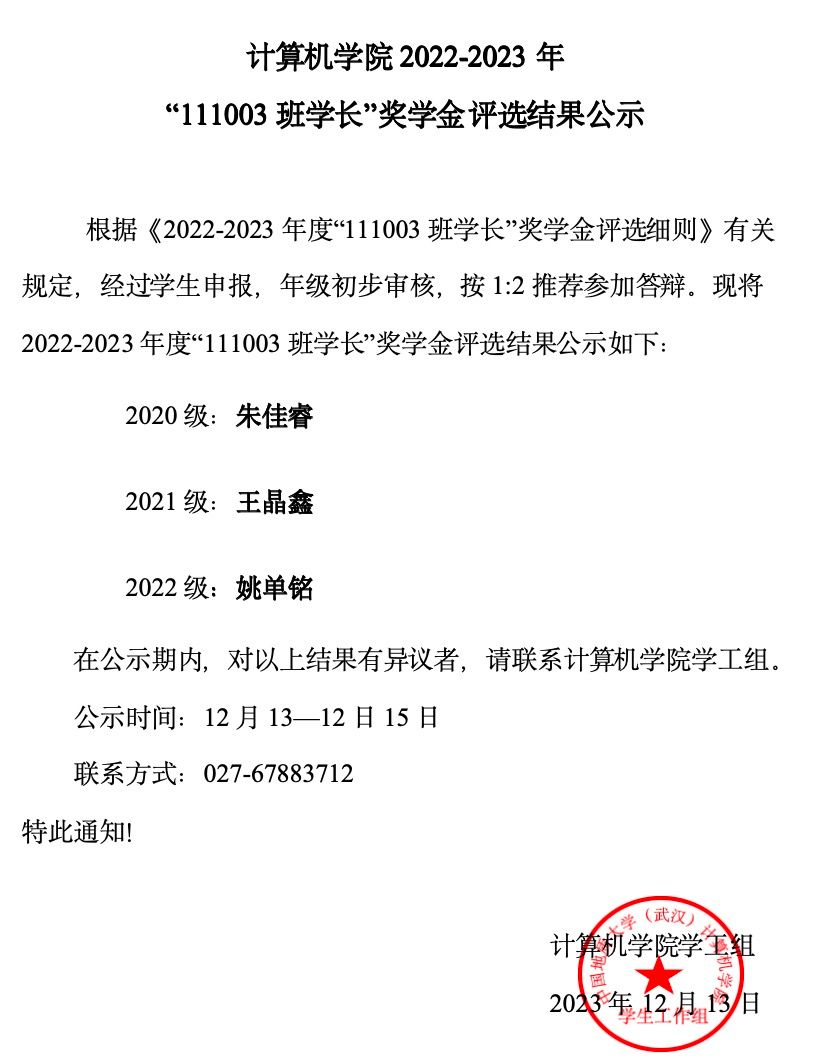 bat365官方网站2022-2023年 “111003班学长”奖学金评选结果公示