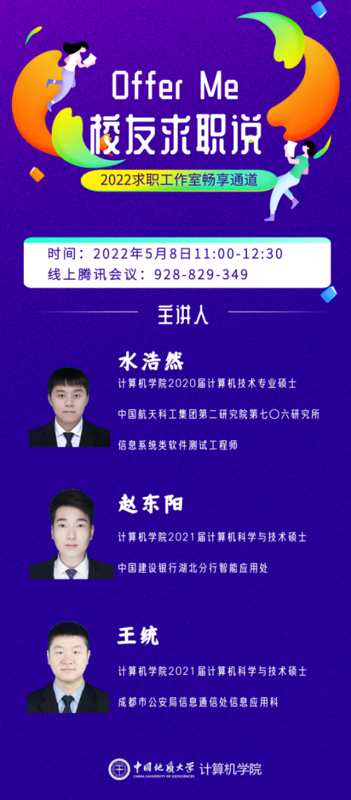 三位校友分别来自研究所、银行和事业单位,无论你的职业规划是互联网大厂或是国企、公务员,他们的分享一定能给你带来不一样的新收获,记得准时参加哦!