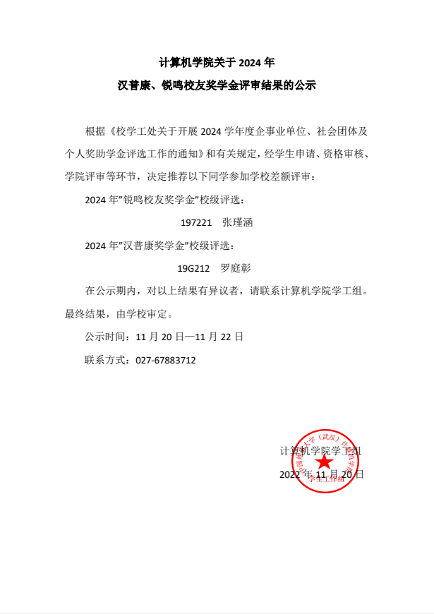 bat365官方网站关于2024年汉普康、锐鸣校友奖学金评审结果的公示