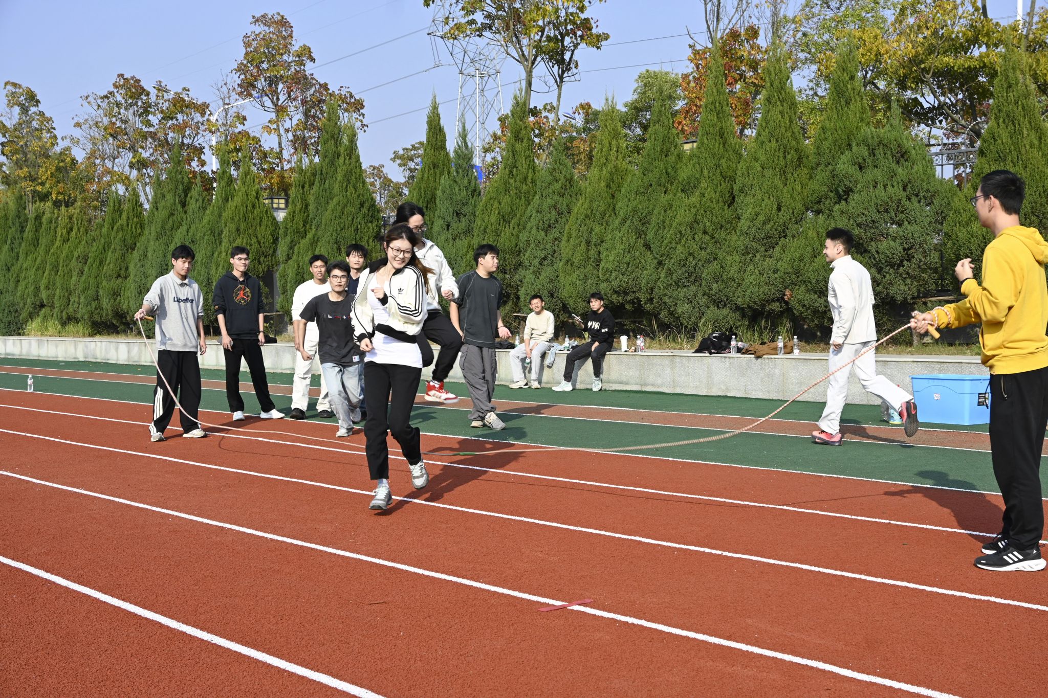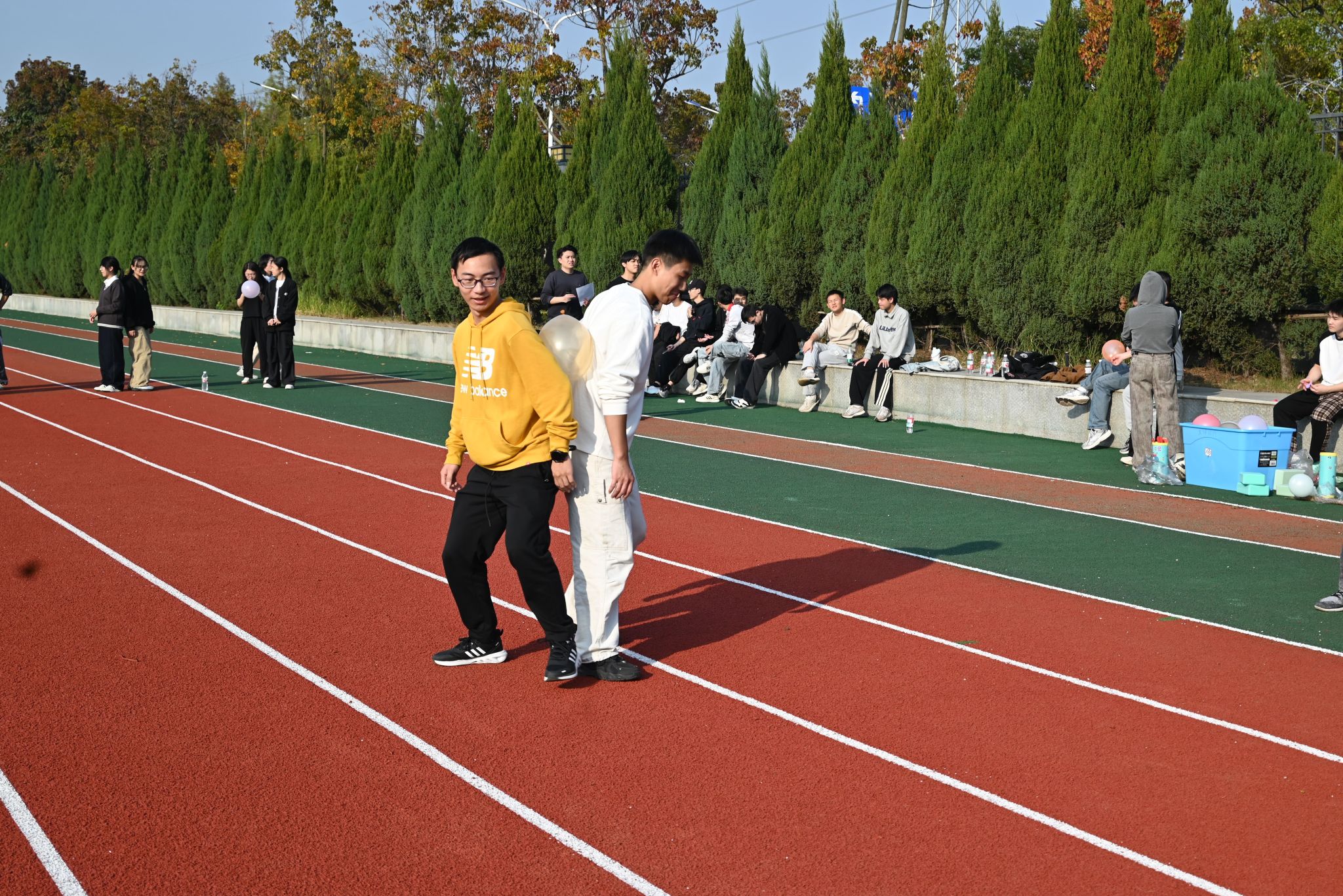 随后进行两项比赛,再次将未来城校区操场上的欢笑与热情推向高潮。跳大绳的同学们脚步轻快、跃动有力,腾空的瞬间充满青春活力;而背靠背夹气球的同学们背靠背紧贴站立,稳稳夹住气球,互相支撑着向前谨慎移动,并在最后冲线的一瞬间挤爆气球,刹那间全场热烈欢呼,气氛和情绪已然到达了顶点。