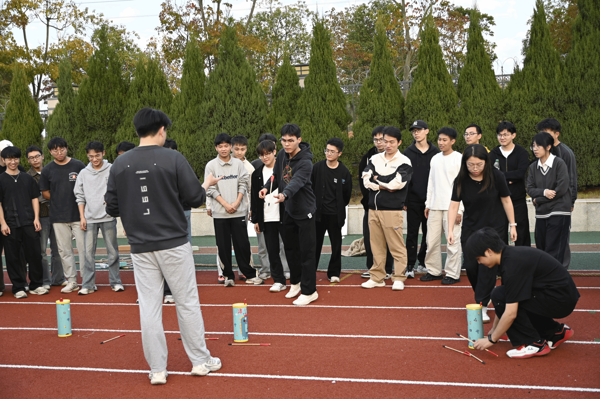 压轴的“投壶”比赛中参赛者聚精会神,力求每一次投掷的准确性。团队成员们互相商量投掷角度和力度,精心配合。比赛节奏紧凑,比分交替上升,现场掌声与喝彩声连绵不断,将活动氛围推向最高潮,也让全场都沉浸在紧张而欢快的竞赛体验中。