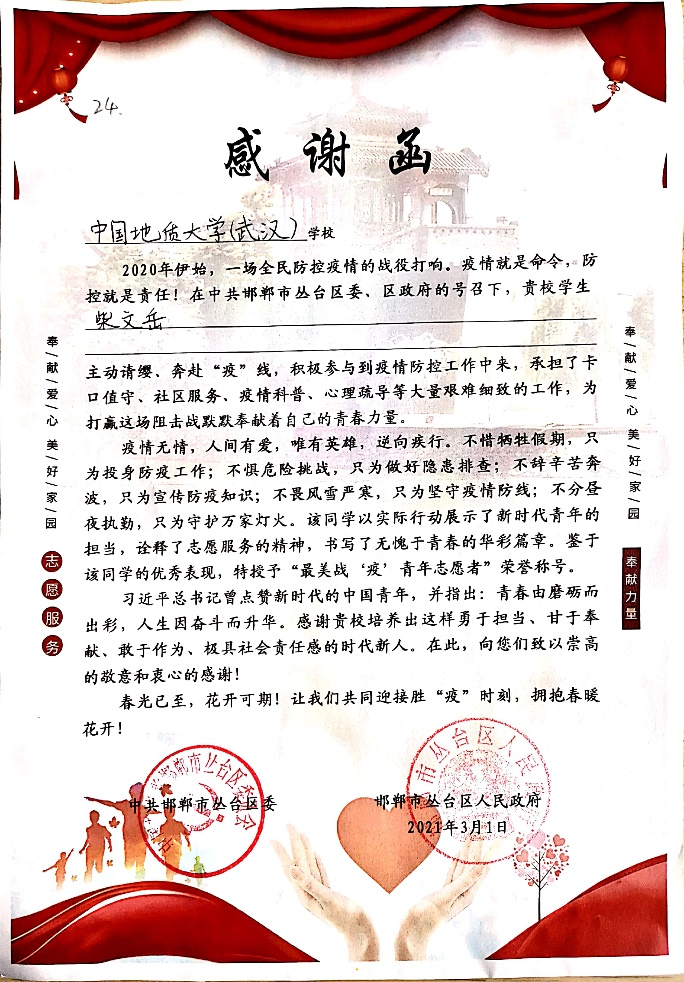 (通讯员:陈宝华)“疫情就是命令,防控就是责任!在中共邯郸市丛台区委、区政府的号召下,贵校学生柴文岳主动请缨,奔赴‘疫’线,积极参与到疫情防控工作中来,承担了卡口值守、社区服务、疫情科普、心理疏导等大量艰难细致的工作,为打赢这场阻击战默默奉献着自己的青春力量……”近日,bat365官方网站(武汉)收到一封中共邯郸市丛台区委、邯郸市丛台区人民政府发来的感谢函,对bat365官方网站191191班柴文岳同学在疫情防控期间的志愿服务表示感谢,授予他“最美战‘疫’青年志愿者”荣誉称号。
