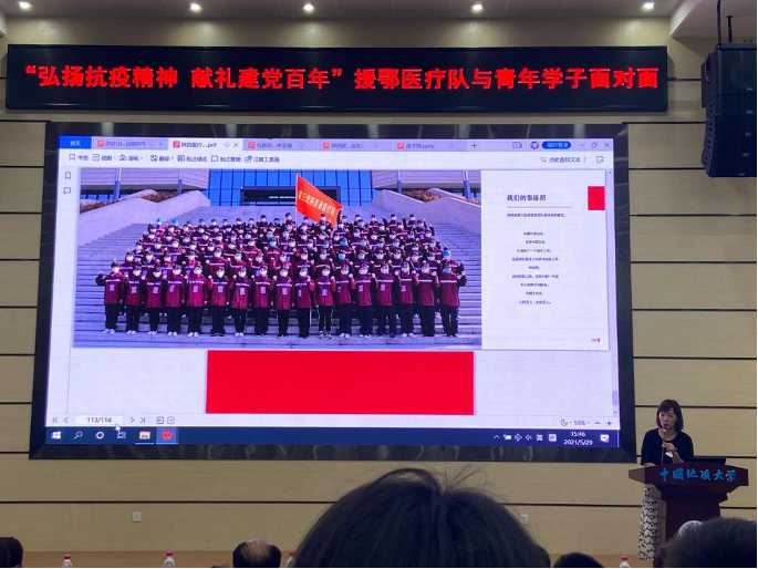 接着,陕西省第三批援鄂医疗队宣传委员、陕西省延安市人民医院李婷护士长作专题报告,李婷护士长饱含深情地介绍了进驻武汉、在汉战斗、凯旋回乡的全过程,从在方舱医院里的辛苦工作,到在未来城驻地的温暖点滴,再到胜利回归时的五味杂陈,每到动容之处,李婷护士长和同学们都潸然泪下。