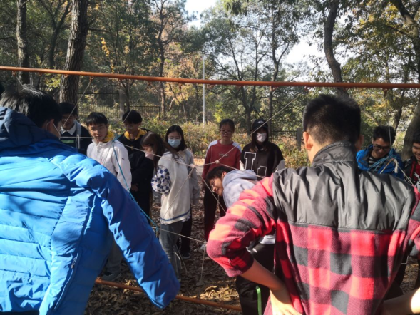 面对“电网”这个拦路虎,同学们团结协作的能力在此刻迸发。在此项目中,用绳子和铁架模拟高压电网,前有“埋伏”,后有“追兵”,同学们需要通过统筹安排,彼此协作,一同通过电网。经过教练的指导和同学们的交流沟通,小组成员们安排好通过的顺序,或穿越或扛举,顺利完成任务。