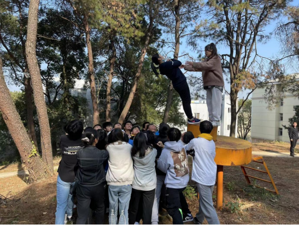 “信任背摔”是一项培养团队合作力及团队成员间信任的活动:一人笔直的从高台上向后倒下,而其他队员则伸出双手接住并保护他。同学们经过教练的指导,认真学习背摔的技巧和标准动作,保护好自己与队友。经此活动,同学们突破自我,战胜恐惧,更培养了团队成员之间的信任,通过身体接触去打破人与人之间隔膜,实现“情感破冰”。