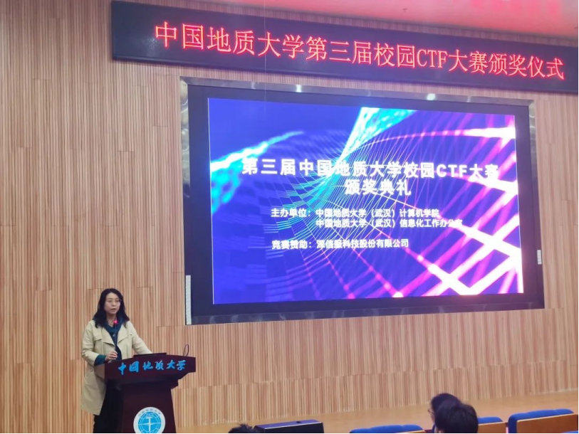 颁奖仪式伊始,傅苑做开场致辞。她对本次竞赛的成功举办表示祝贺,充分肯定参赛选手的努力,鼓舞同学们再接再厉、积极进取;激励同学们从学科专业出发,树牢总体国家安全观,守护网络安全,清朗网络空间,筑牢网络防线。傅苑为老生组一等奖获得者陈凯明,新生组一等奖获得者汪润东颁奖。程池和黄诗勇为老生组二等奖得主付兀哲、黄翠,新生组二等奖得主孙升阳、张桐颁奖。高浪和朱静为老生组三等奖选手马睿、周意芯、赵起萌、张福茂、耿春秋,新生组三等奖选手伍梦扬、高会胜、邰霄、朱轩宇颁奖。获得本次CTF大赛优秀奖的选手是肖炎徐、李沐卿、霍奥林、胥瑞、李国立、高晔豪、乔晓晓、高尚、王岸冲、夏莹莹。