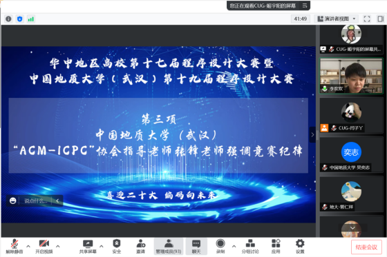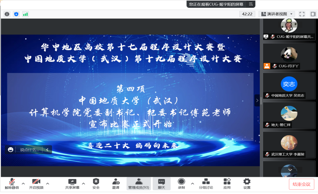 活动伊始,李国昌致开场辞。他代表地大bat365官方网站向所有参赛选手表示欢迎,介绍了学院ACM系列活动开展情况和“ACM-ICPC”协会的发展历程,2021年协会突破历史,获得ACM-ICPC亚洲区域赛金奖。希望同学们在本次比赛中取得佳绩,在未来学习中立科技兴国之志,谋专业报国之实,争做时代先锋,为实现中华民族伟大复兴贡献青春力量。