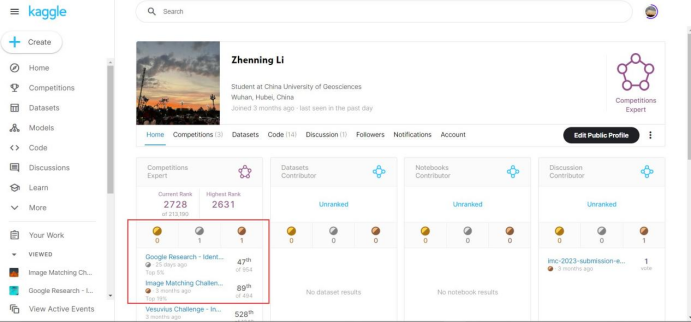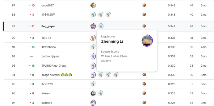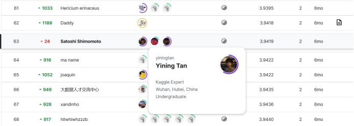 五场比赛历时3个月,分别吸引了来自全球多个国家的494支队伍,954支队伍,3547支队伍,1805支队伍和1033支队伍报名参加。经过激烈的角逐,来自我校的李桢宁同学在两场比赛中分别获得了铜牌(前19%)和银牌(前5%),SatoshiShimomoto队伍在三场比赛中分别获得了三枚银牌(Top2%,Top4%,Top5%)。