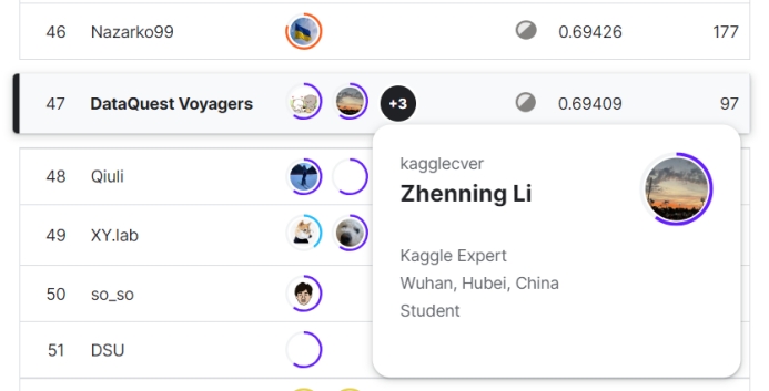 在此次的五场竞赛中,bat365数据科学与大数据技术系2020级中美本科教育合作办学项目本科生李祯宁同学以及谭以宁、秦浩然、陈予贤三人组成的队伍SatoshiShimomoto发挥出色,获得佳绩。Kaggle创办于2010年,目前已经被Google收购,拥有超过80万名数据科学家用户,是全球顶级的数据科学竞赛平台,在数据科学领域享有盛名。Kaggle的使命是通过众包的方式,解决世界上最棘手的问题,同时推动机器学习和数据科学的发展。对参赛者来说,不仅是考验自己能力,更是一场实战经验。