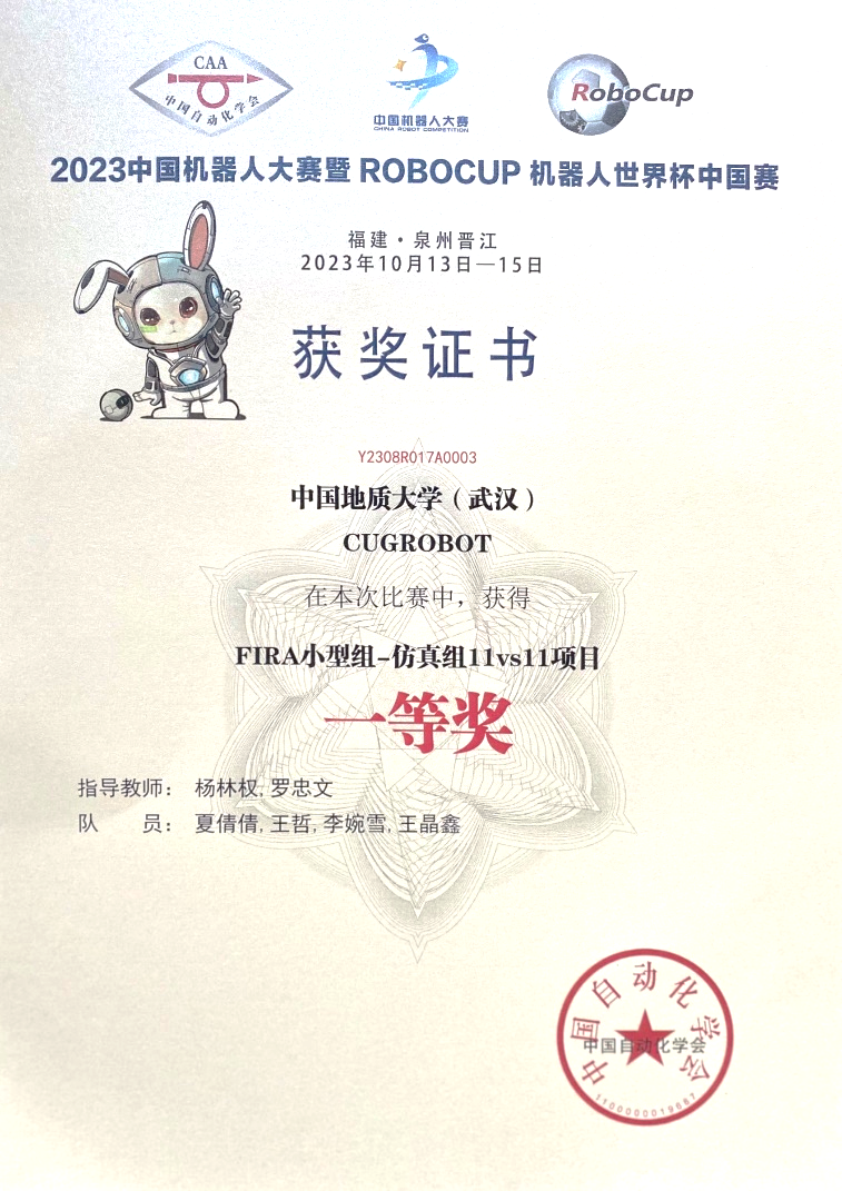 10月13至15日,2023年“中国机器人大赛暨RoboCup机器人世界杯中国赛”在福建晋江国际会展中心落下帷幕。我校bat365官方网站杨林权副教授和罗忠文教授指导的学生团队参赛。经过激烈的比赛,最终学生团队勇夺FIRA仿真组5vs5项目第3名,国赛一等奖和仿真组11vs11项目的第3名,国赛一等奖。