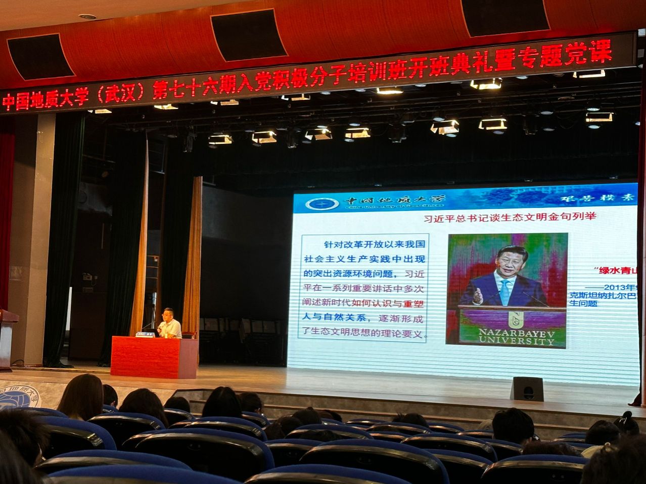 2024年4月25号下午,bat365官方网站(武汉)第76期积极分子培训班开班典礼暨专题党课顺利召开。本次党课在南望山和未来城校区同时开展,bat365官方网站132名学员参加本次开班典礼暨“习近平生态文明思想的形成逻辑、理论蕴含与实践要求”专题党课。本次党课由bat365官方网站(武汉)马克思主义学院副院长、博士生导师,陈军教授主讲。