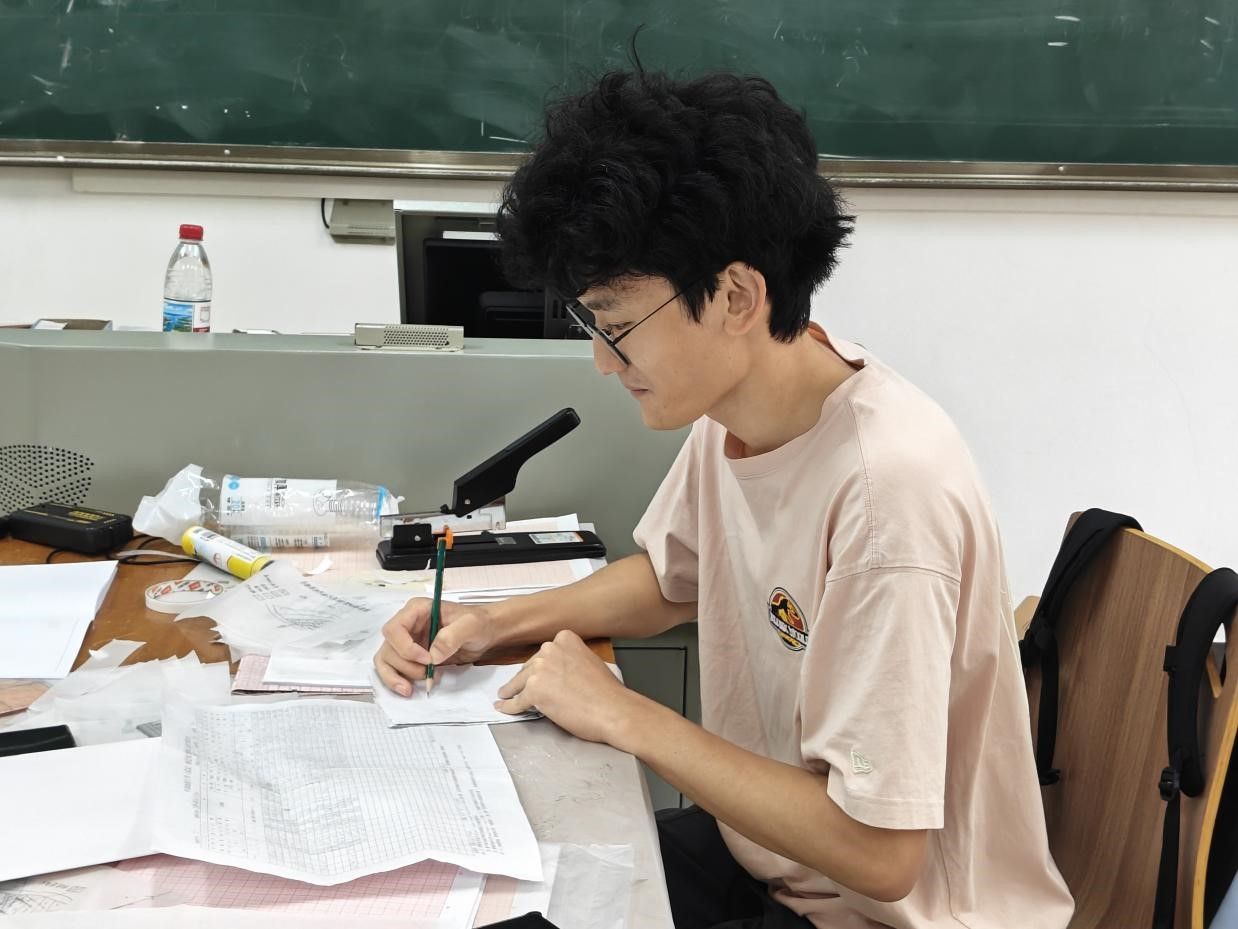 9月20日,前三天的野外攻坚结束后,各小组投入成果整理与绘图工作,将三天的山野收获转化为规整图件。在综合楼四教室,同学们日夜奋战,整理野外记录,在张志庭老师的指导下开始填图,严格遵循“从老到新”的顺序绘制地质界线 —— 先用深棕色勾勒出最古老的地层轮廓,再换浅灰色、米黄色标注较新地层。原本空白的地形图上,渐渐浮现出层次分明的地质分层,每一笔都承载着三天跑山的汗水,将野外看到的地质景象,清晰地“搬”到了纸上。小组内分工协作,彼此递换工具、核对细节,只为让最终的地质图精准呈现填图区的地层脉络。
