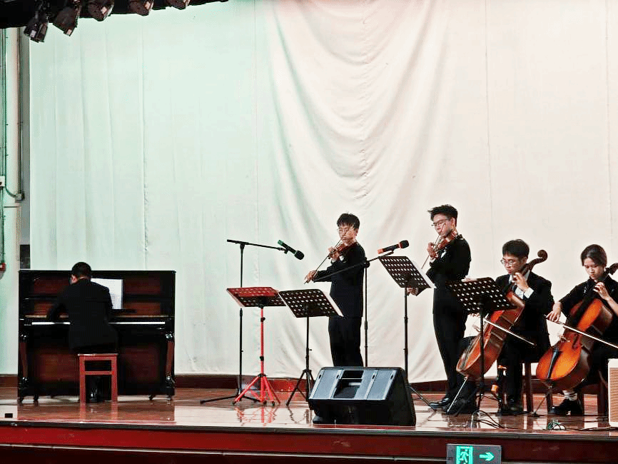 在热烈的掌声中,马艺萱、张佳乐、于千朔、郑天宇四位主持人一齐登场,正式宣布晚会的开始。