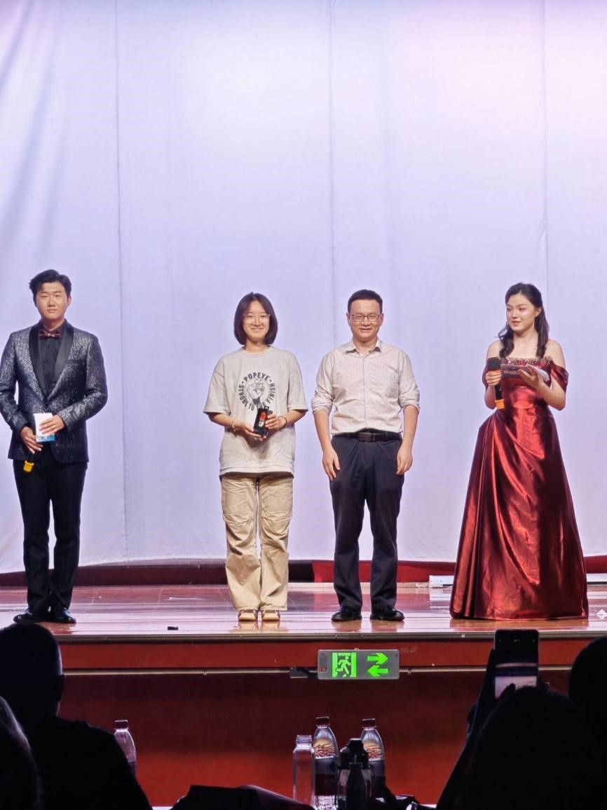 歌声的余韵还在空气中隐隐回荡,灯光便聚焦到了舞台中央,最激动人心的一等奖抽奖环节终于到来。在全场期待的目光中,此次抽奖环节的嘉宾张洪艳院长上台,在同学们的欢呼声中揭晓了今晚一等奖的获得者,将现场氛围推向顶点。
