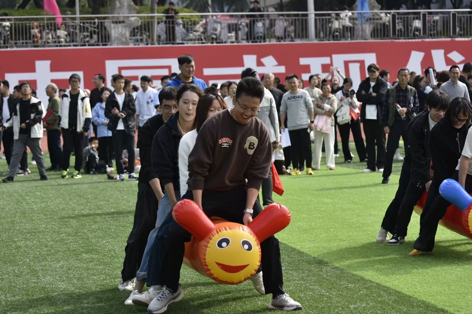 当老师们从讲台步入赛场,运动会被注入了别样的活力与温情。“欢乐毛毛虫25米”项目趣味横生,老师们协同步伐,骑着充气道具努力“蠕动”前行,最终获得第七名;“组合成语25米”接力赛中,他们一改平日的沉稳,步伐矫健,奋力向前,最终获得第八名;“一圈到底”项目中,教师队伍配合默契,呼啦圈在默契衔接中“丝滑”流转;“无敌风火轮25米”项目和“协力向前冲25米”项目,伴随着此起彼伏的加油与欢笑声,众人齐心向前行!