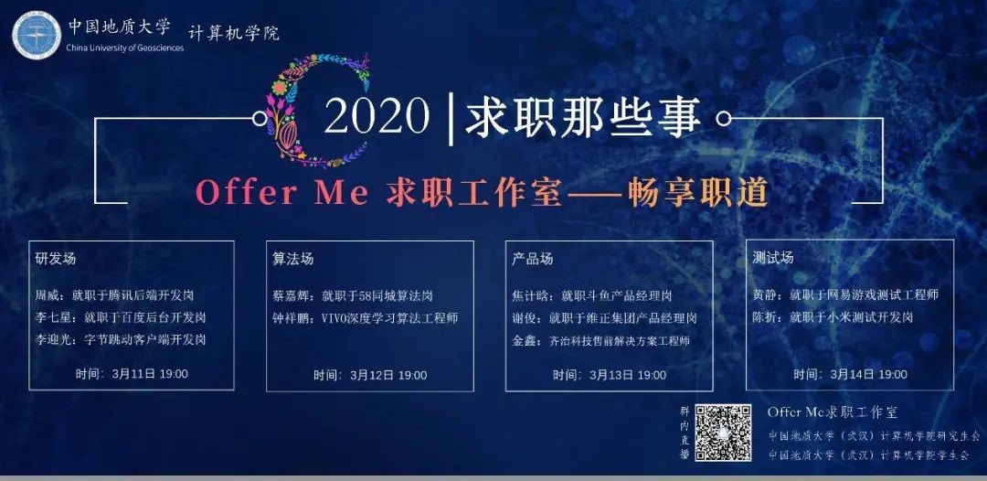 3月11日至3月14日晚,bat365官方网站研究生会“offer me 求职漫谈”经验分享系列活动成功举办。疫情当前,停课不停学,隔离不隔爱。活动共邀请11位学长学姐在线分享求职经验,并深入讲解和剖析求职技巧。