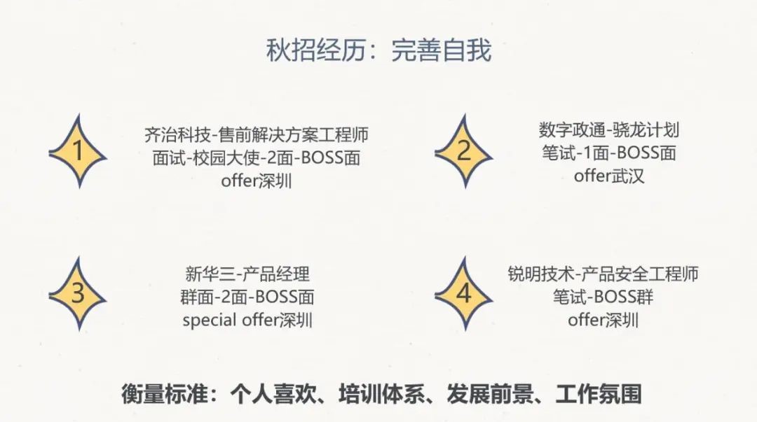 通过学长学姐们的分享突出强调了不断积累的重要性,找到好工作不是一蹴而就的,这中间会有一些挫折。面对挫折,不是畏步不前,而是多看多学多交流,不断总结提升自我,充分利用学校提供的资源,实现自己的职业规划。