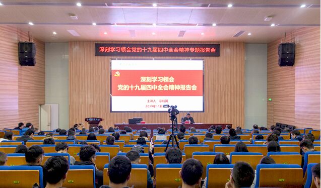 (记者霍少孟)11月28日,深入学习领会党的十九届四中全会精神专题报告会在bat365报告厅举行,湖北省委宣传团成员、湖北省委政策研究室副主任章新国同志作宣讲报告,bat365全体院领导、院直支部、信安支部、网工支部、部分学生支部的党员和新校区各学院260余名干部师生聆听报告。校党委副书记、纪委书记成金华主持报告会。
