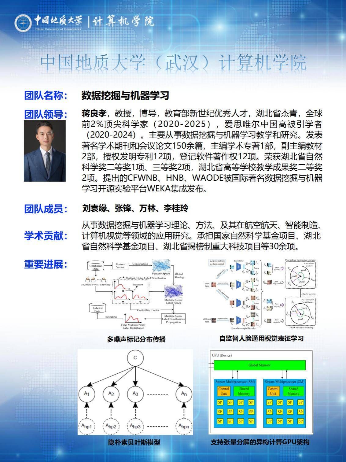 bat365官方网站蒋良孝教授领导的数据挖掘与机器学习团队连续获得国家自然科学基金项目、湖北省自然科学基金重点项目、湖北省揭榜制重大科技项目等资助,自主研发数据挖掘与机器学习系列理论及其应用创新成果,发表著名学术期刊和会议论文500余篇,授权国家发明专利50余项,登记计算机软件著作权30余项,出版教材专著10余部,荣获省部级以上奖励10余项。与国内外同类产品相比,具有高效和鲁棒的特点,目前已经在航空航天、智能制造、计算机视觉等领域推广应用,并获得广泛认可与好评,具有广泛的市场前景和预期经济效益。