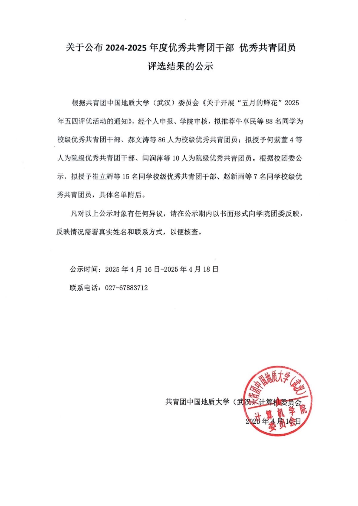 关于公布2024-2025年度优秀共青团干部、优秀共青团员评选结果的公示