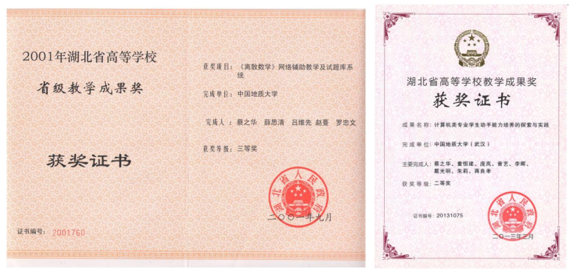 自1986年任教以来,蔡之华老师长期主讲本科生课程和研究生课程,包括数据结构、离散数学、机器学习、计算机应用数学,承担过本科生学务指导老师和班主任工作。他任班主任的班级曾荣获“湖北省优秀班集体”。他非常重视课堂教学,常对学生说:“高效的课堂学习是培养学科兴趣的动力。”蔡老师“组合数学”(学生们习惯称呼,实为“计算机应用数学”)经常板书推导公式,给学生留下了深刻印象。他带领教学团队,积极探索新教学模式,延展课堂教学空域和时域,优化教学交互过程,提升教学质量。他带领的教研团队多次获得湖北省、学校教学成果奖,主持的教研项目获湖北省人民政府二、三等奖各1项,公开发表教研论文5篇,编写教材3部,其中一部获得bat365官方网站普通高校优秀教材一等奖。他是国家一流本科专业“计算机科学与技术”建设点的负责人。