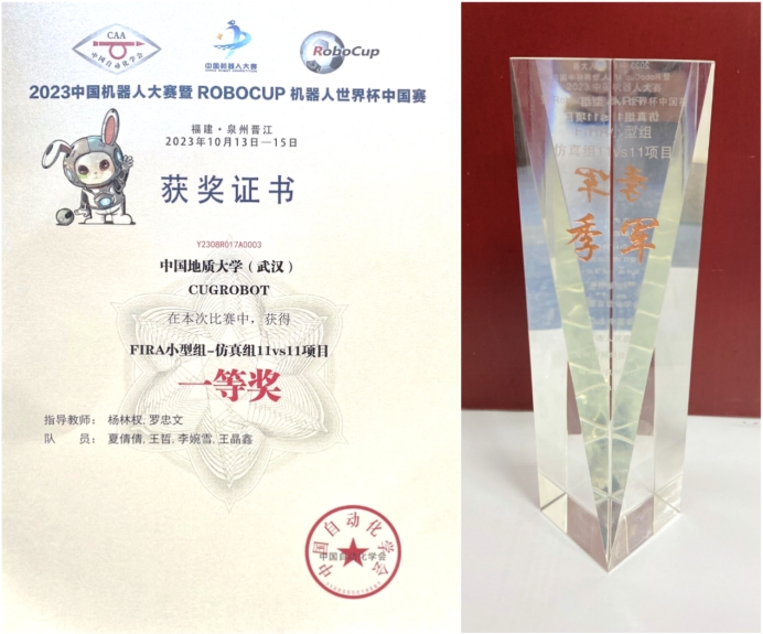 10月14日上午,FIRA仿真组11vs11项目比赛也正式开始。经过相对轻松的小组赛后,进入淘汰赛,我们CUG团队在11vs11项目中也展现出了非凡实力。为了更好地分析己方和对方的优势和弱点,我们进行了赛程中的录像以便于我们后续的分析和策略完善。10月14日下午,FIRA仿真组11vs11项目决赛,我们团队在比赛过程中不断调整策略,优化算法,克服了各种挑战和困难。裁判们严格公正地执行规定,确保比赛的公平性和公正性。10月15日上午,FIRA仿真组5vs5项目决赛,每个人都保持高昂的斗志,沉浸于紧张的比赛局势中。最终,我们获得FIRA仿真组5vs5项目季军、一等奖,FIRA仿真组11vs11项目季军、一等奖。