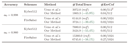 论文采用了模拟实验和板上实验相结合的方式进行评估与验证,并与多数投票消错(Ravi等人在CHES2020上使用)以及波形聚合消错(Ueno等人在CHES2022使用,为目前最好结果)两种方法进行了对比。实验结果表明,该论文中方法相比于后者可以减少45.9%、 55.4%的总问询次数。在此同时,类似于Ueno等人的效果,该论文提出的方法可以成功恢复几乎全部的多项式系数,即在512个系数中平均只有0.04或0.05个发生错误。