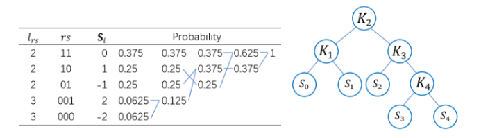 近来研究者发现密钥重用攻击不仅对CPA安全的格密钥交换方案有效,而且在侧信道攻击中,还可以用来攻击CCA安全的方案。目前的攻击方案大都只针对单独的某个方案,因此存在一个基本问题:我们能否找到一种统一的方法来评估针对所有NIST候选方案发起密钥不匹配攻击所需的问询(即密钥匹配和不匹配)次数。在2019年的欧密会上,Băetu等人试图回答该问题,但他们的大多数结果仅与部分未进入第二轮的候选方案有关,并未实现对所有候选方案的统一评估。该文的基本思想是将寻找问询次数下界的问题转化为寻找一棵最优二叉恢复树(BRT);通过利用哈夫曼编码技术,可以成功构建一棵最优BRT,并得到其平均问询次数的下界。以Kyber 1024为例,图一展示了作者如何通过哈夫曼编码技术构建一颗最优BRT: